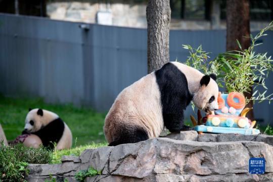 4月16日,在美國華盛頓史密森學(xué)會國家動物園,大熊貓“美香”(右)享用冰凍水果蛋糕。新華社記者 劉杰 攝