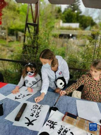 4月16日,在美國華盛頓史密森學(xué)會國家動物園,游客體驗用毛筆書寫漢字“大熊貓”。新華社發(fā)