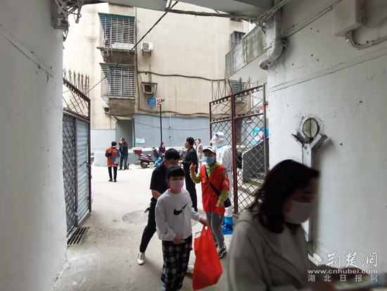 在外灘聚龍城小區(qū)值守的葉飛拿著酒精壺不停地維持秩序和消毒:“大家每個人間隔一米,先把綠碼或者身份證準(zhǔn)備好,不要急?!比~飛不厭其煩地對居民說。