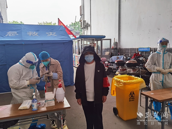 “在家里坐著也沒事做,不妨出來貢獻一份力量?!比~飛說道。4月17日,鄂城區(qū)實行第四輪全員核酸,早上7點鐘,葉飛和肖運琴就做好防護,準(zhǔn)備前往各自的包??c,維持核酸檢測的紀(jì)律。