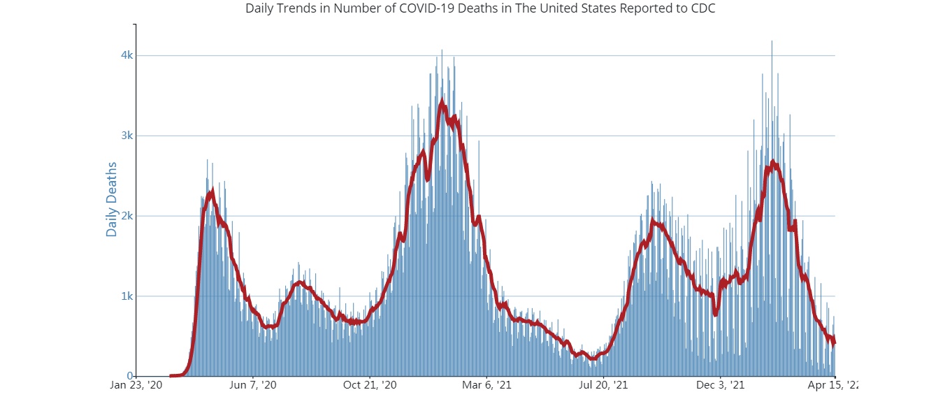 這是美國疾病控制和預(yù)防中心2022年4月16日公布的美國日增新冠死亡病例趨勢圖。(圖片來源:美國疾病控制和預(yù)防中心網(wǎng)站)
