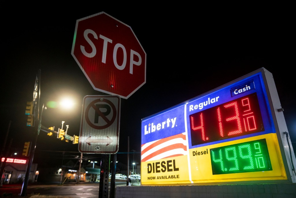 這是3月31日在美國(guó)弗吉尼亞州阿靈頓拍攝的一處加油站的油價(jià)顯示牌。新華社記者劉杰攝