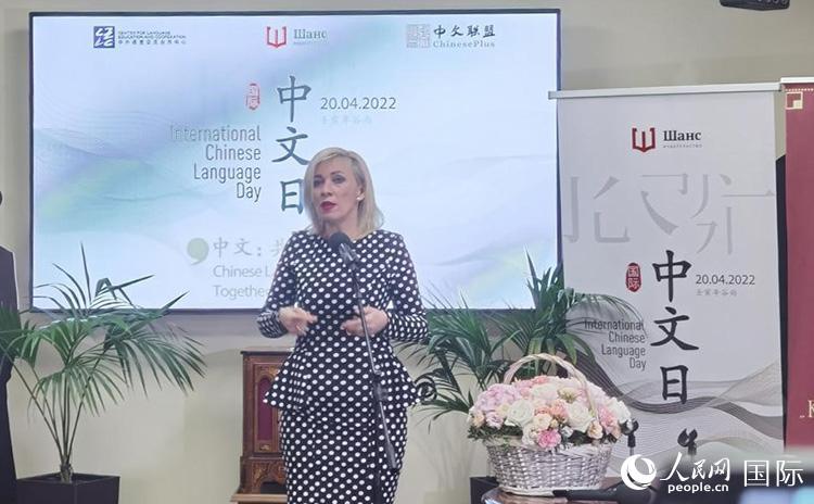 俄羅斯外交部信息與出版司司長扎哈洛娃致辭。人民網(wǎng)記者 榮翌攝