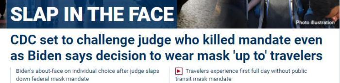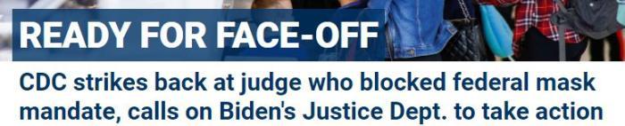 ??怂剐侣劸W(wǎng)21日的頭條標(biāo)題為“準(zhǔn)備對峙:美疾控中心呼吁司法部采取措施,回?fù)魪U除口罩令的法官”。圖片來源:福克斯新聞網(wǎng)報道截圖。