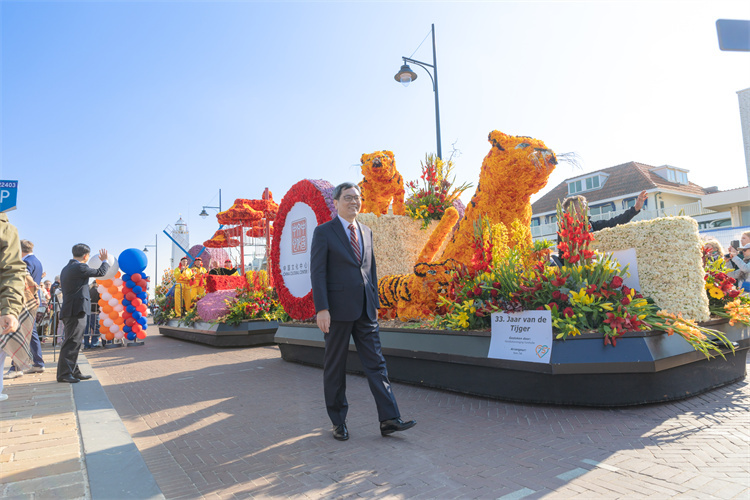 中方主題花車共有兩組,用2萬只鮮花精心裝飾,以慶祝中國和荷蘭建交50周年,向荷蘭公眾展示中國文化。今年是農歷虎年,第一組花車以老虎為核心元素,取其正義、勇猛、威嚴的寓意。第二組花車載有中荷建交50周年標志,象征荷蘭的風車和象征中國的燈籠通過一座花橋連接,寓意通過花車巡游加深中荷文化交流?;ㄜ嚿线€有中國大鼓現(xiàn)場表演及身著中荷傳統(tǒng)服裝的舞者,為花車巡游增添了更多亮點。