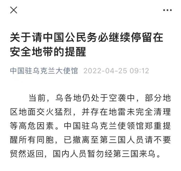中新網(wǎng)4月25日電 北京時(shí)間25日,中國駐烏克蘭大使館發(fā)布關(guān)于請中國公民務(wù)必繼續(xù)停留在安全地帶的提醒。