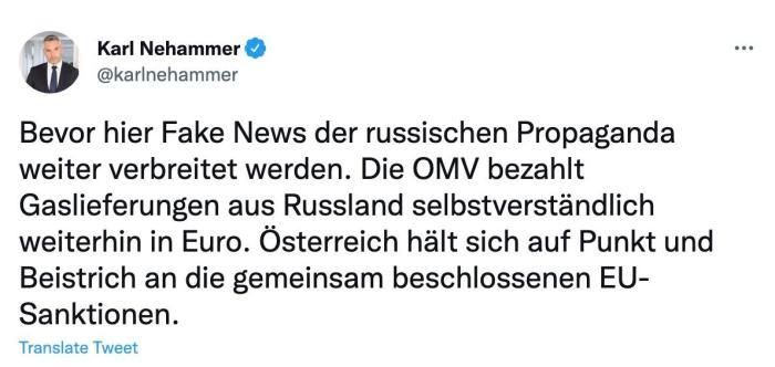 奧地利總理內(nèi)哈默27日通過其社交媒體表示,俄羅斯媒體關(guān)于奧地利以盧布支付俄天然氣的消息是假新聞。奧地利石油天然氣集團(tuán)(OMV)仍然在用歐元為俄羅斯天然氣付款,奧地利將堅持執(zhí)行歐盟各成員國共同商定的對俄制裁措施。(總臺記者 易歆)