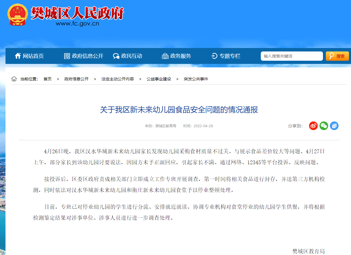接投訴后,區(qū)委區(qū)政府責(zé)成相關(guān)部門立即成立工作專班開展調(diào)查,第一時(shí)間將相關(guān)食品進(jìn)行封存,并送第三方機(jī)構(gòu)檢測,同時(shí)依法對漢水華城新未來幼兒園和衡莊新未來幼兒園食堂予以停業(yè)整頓處理。