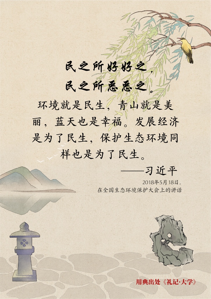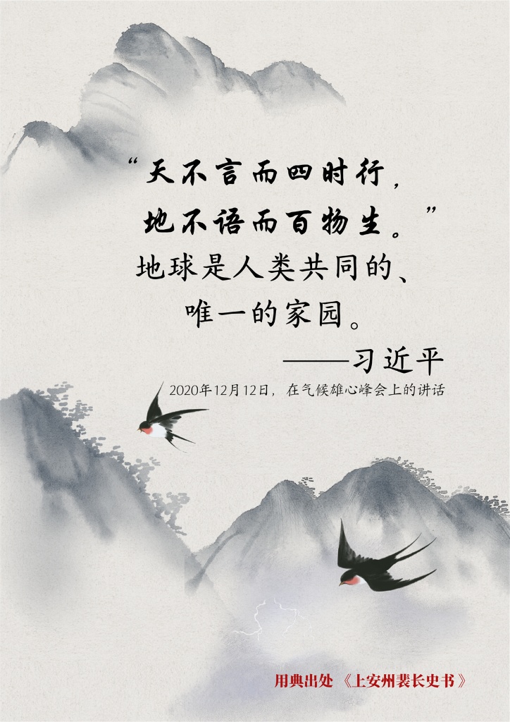 中華民族向來尊重自然、熱愛自然,綿延5000多年的中華文明孕育著豐富的生態(tài)文化。在國內(nèi)外多個場合,習(xí)近平多次引用中國傳統(tǒng)文化中的古典名句,為共建清潔美麗的世界“典”明中國智慧。