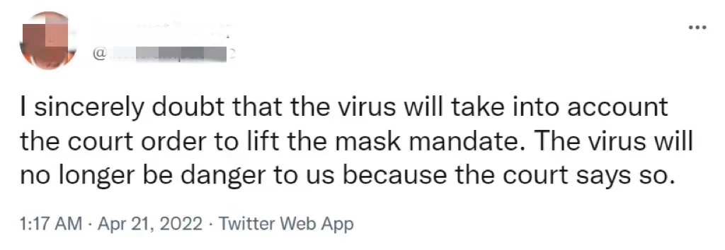 有網(wǎng)友直接諷刺道:“我真的懷疑新冠病毒是否會(huì)考慮到法院取消口罩令的裁決。因?yàn)殍b于法院的說(shuō)法,病毒將不再對(duì)我們構(gòu)成危險(xiǎn)?!?/p>