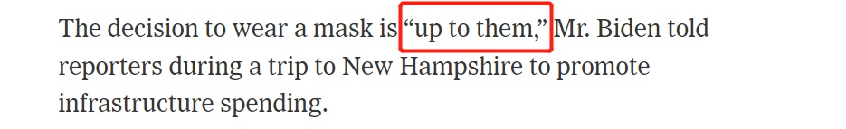 面對(duì)是否需要取消“口罩令”的這一亂局,美國(guó)總統(tǒng)拜登只是說(shuō)了一句:“隨他們吧。”