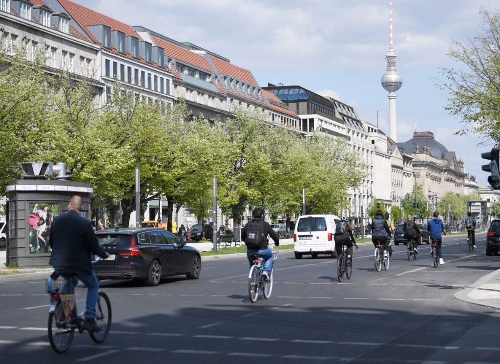4月28日,人們在德國柏林菩提樹下大街騎行。新華社記者任鵬飛攝