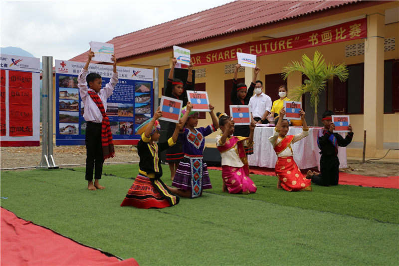 孩子們還為中國叔叔表演了老撾傳統(tǒng)節(jié)目。他們舉著中老鐵路的圖畫,舉著寫著“團結(jié)”的書法作品,跳起傳統(tǒng)舞蹈,祝福中老友誼。