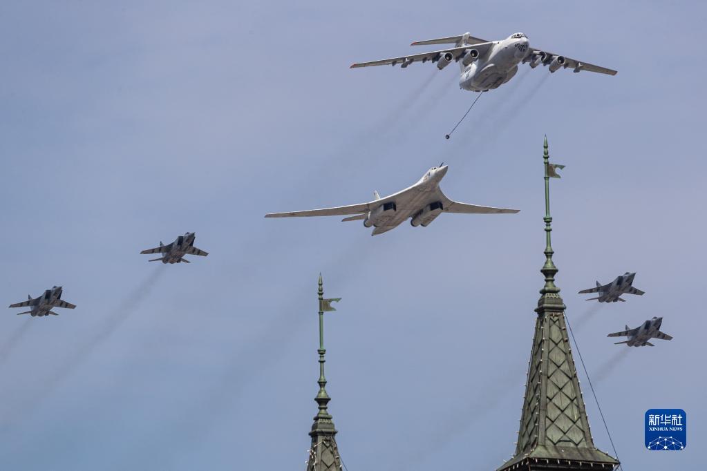 5月7日,在俄羅斯首都莫斯科,米格-31戰(zhàn)機、圖-160戰(zhàn)略轟炸機、伊爾-78空中加油機(從后至前)編隊飛過紅場上空。新華社記者 白雪騏 攝