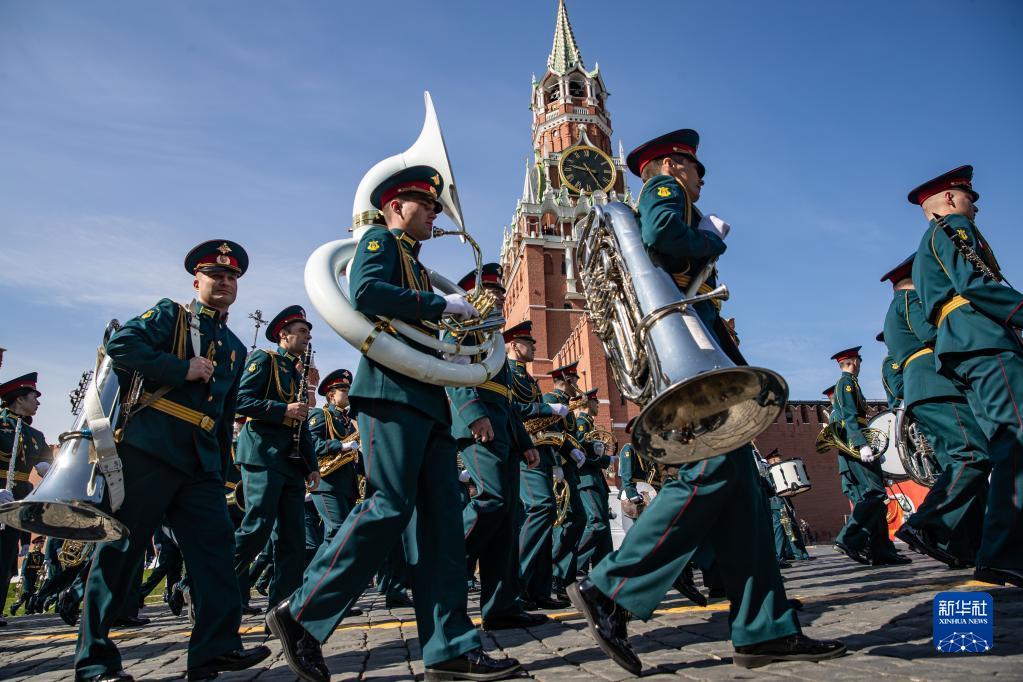 5月7日,在俄羅斯首都莫斯科,軍樂團在總彩排開始前列隊行進。新華社記者 白雪騏 攝