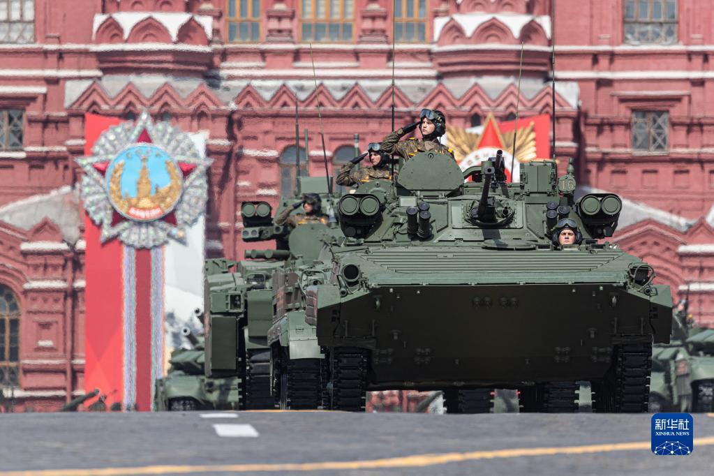 5月7日,在俄羅斯首都莫斯科,步兵戰(zhàn)車編隊駛過紅場。新華社記者 白雪騏 攝