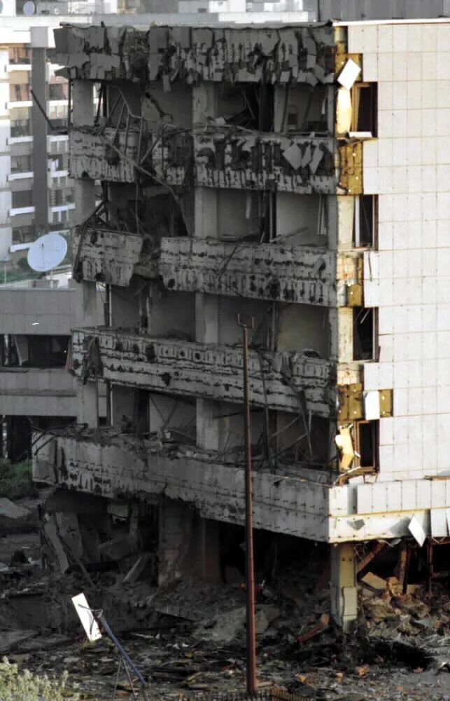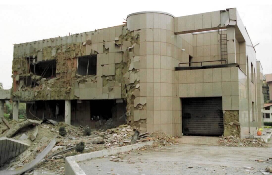 圖為大使館在爆炸中嚴重被毀的一側(cè)建筑。新華社記者黃文攝