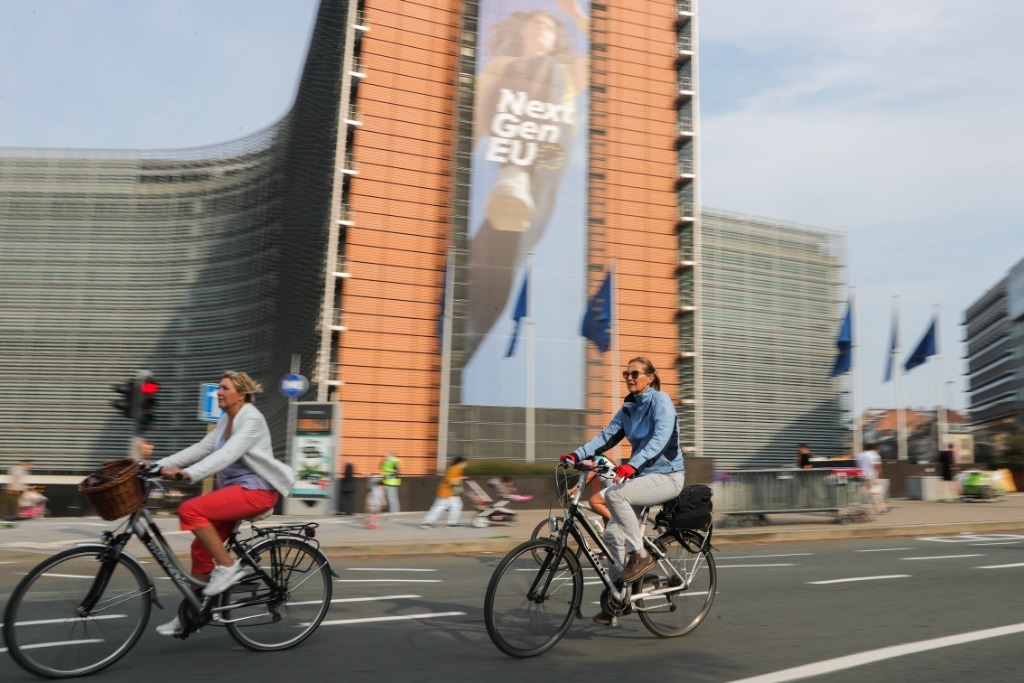 2021年9月19日,在比利時(shí)布魯塞爾,人們騎車經(jīng)過歐盟委員會總部大廈。新華社記者鄭煥松攝