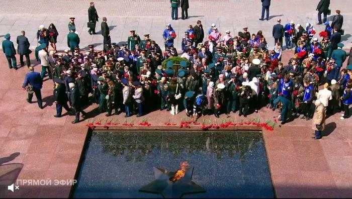 在《神圣的戰(zhàn)爭(zhēng)》音樂(lè)的伴奏下,俄羅斯的國(guó)旗和勝利旗——伊德里茨第150步兵師的突擊旗出現(xiàn)在紅場(chǎng)上。俄羅斯總統(tǒng)普京、總理米舒斯京、莫斯科市長(zhǎng)索比亞寧出席閱兵式。