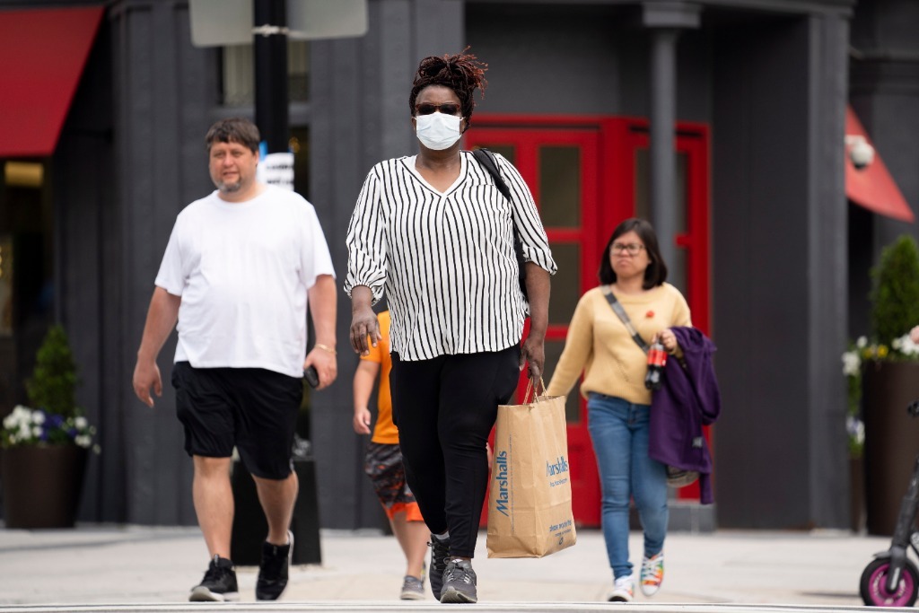 5月11日,在美國首都華盛頓,一名行人提著購物袋走過街頭。新華社記者劉杰攝