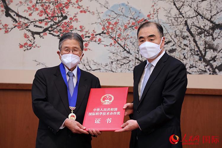| 孔鉉佑向藤嶋昭頒授獎(jiǎng)?wù)潞瞳@獎(jiǎng)證書。人民網(wǎng)記者 岳林煒攝 |