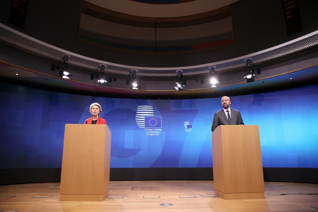 2021年8月24日,在比利時(shí)布魯塞爾,歐洲理事會(huì)主席米歇爾(右)與歐盟委員會(huì)主席馮德萊恩出席記者會(huì)。新華社記者鄭煥松攝