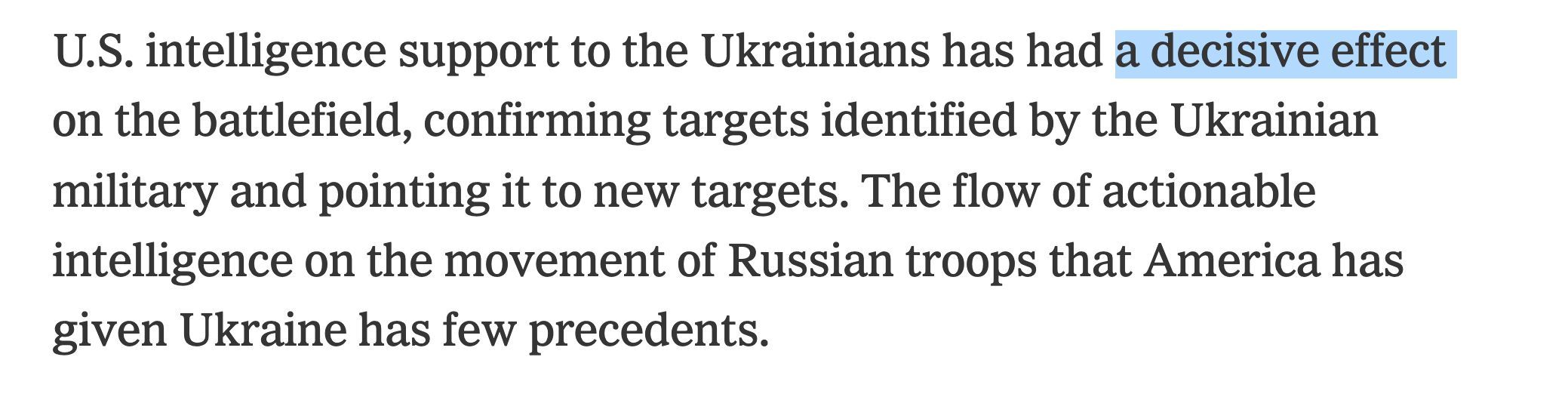 而多位匿名美國(guó)官員則確認(rèn),這與美國(guó)向?yàn)蹩颂m提供的情報(bào)支持有關(guān)。 俄烏沖突以來,美方提供了許多重要情報(bào),包括俄羅斯軍事總部的位置、截獲的俄軍對(duì)話,這些信息有助于定位俄軍高級(jí)官員,使烏軍可對(duì)這些地點(diǎn)和個(gè)人發(fā)動(dòng)襲擊。這種有關(guān)特定目標(biāo)的情報(bào)支持是拜登政府向?yàn)蹩颂m提供實(shí)時(shí)戰(zhàn)場(chǎng)信息的秘密行動(dòng)的一部分,在烏軍對(duì)俄作戰(zhàn)起到了“決定性作用”。