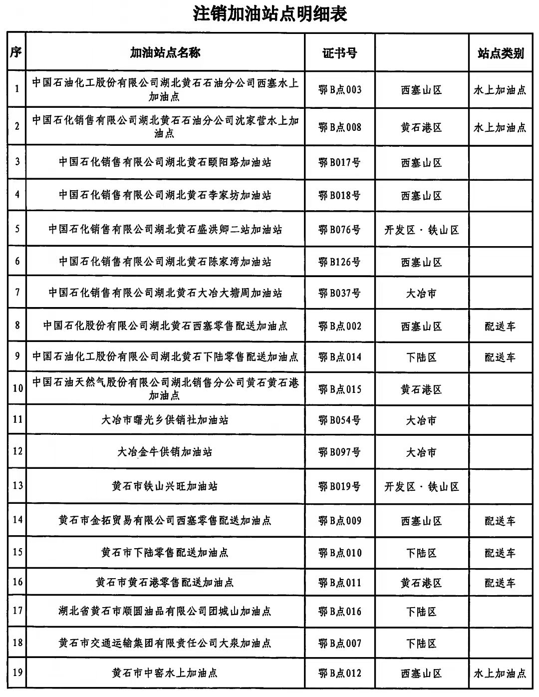 5月16日,黃石市商務(wù)局發(fā)布公告稱,注銷中國石化銷售有限公司湖北黃石頤陽路加油站等19家加油站點(diǎn)成品油零售經(jīng)營批準(zhǔn)證書。