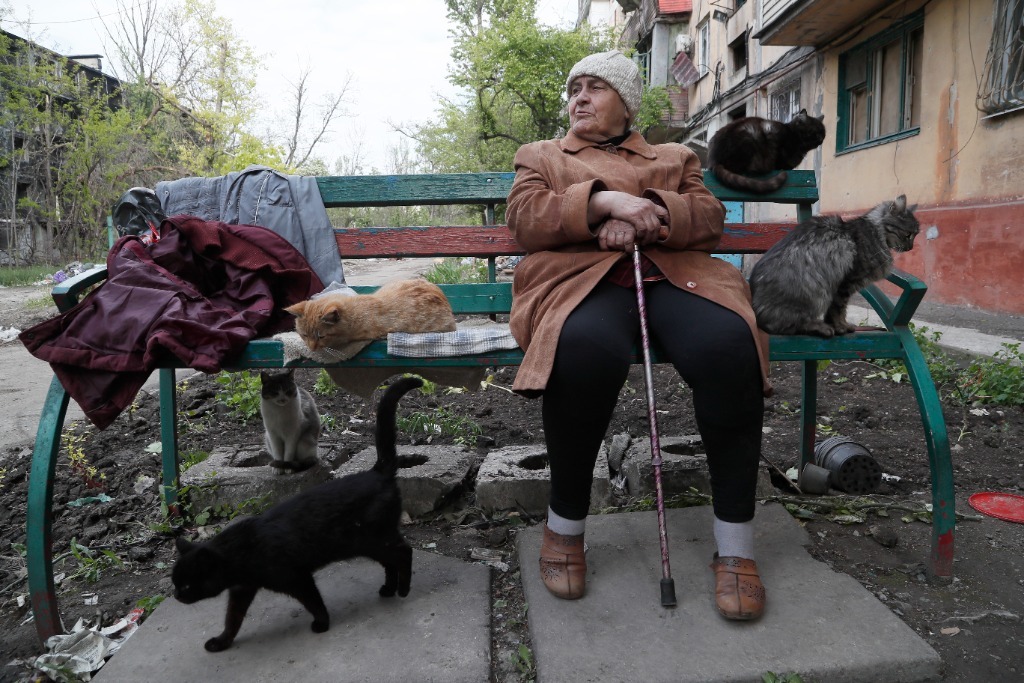 5月15日,在馬里烏波爾,一位當?shù)鼐用褡谑彝庑菹?。新華社發(fā)(維克托攝)