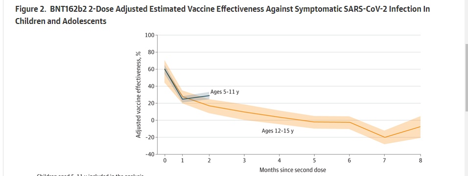 研究圖表顯示,青少年和兒童在接種第二針輝瑞疫苗1個月后,有效性直線下降;對于12至15歲的青少年而言,接種第二針輝瑞疫苗5個月后有效性降為0。