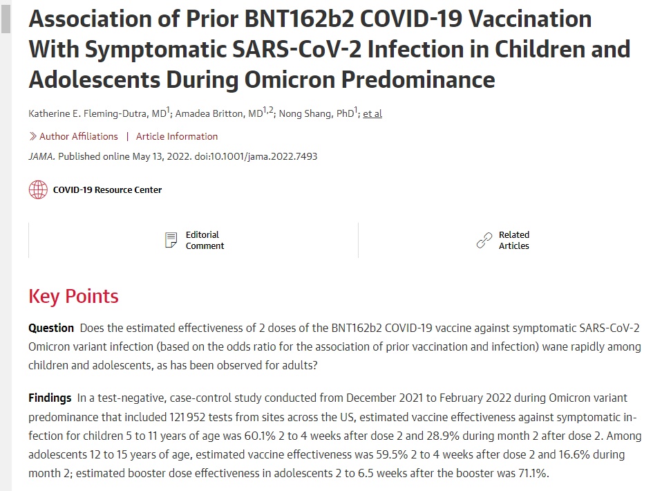 文章在要點部分寫道,研究人員通過對2021年12月至2022年2月,來自全美各檢測點的121952份檢測結(jié)果的研究得出結(jié)論:12至15歲的青少年在接種第二針輝瑞疫苗后的2到4周內(nèi),疫苗有效性為59.5%;在接種第二針的第二個月內(nèi),有效性下降到16.6%;對于5到11歲的兒童而言,接種輝瑞疫苗第二針后2到4周內(nèi),有效性為60.1%,接種第二個月內(nèi)有效性下降到28.9%。預計青少年接種加強針后的2到6.5周內(nèi),疫苗有效率將提高到71.1%。