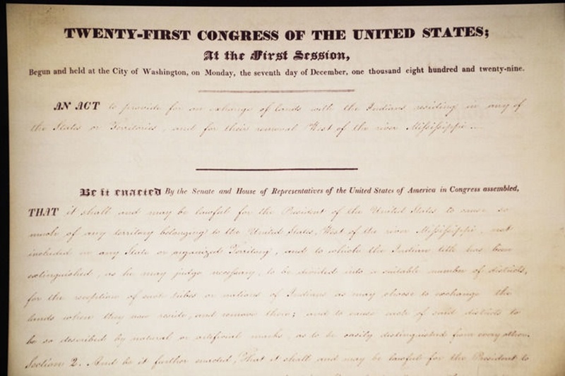 這是5月17日在美國華盛頓拍攝的美洲印第安人國家博物館里展示的《印第安人遷移法》文件復(fù)制品。新華社記者劉杰攝