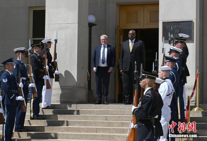 當?shù)貢r間5月18日,瑞典國防大臣胡爾特奎斯特(左)到訪五角大樓,與美防長奧斯汀(右)舉行會晤。中新社記者 陳孟統(tǒng) 攝
