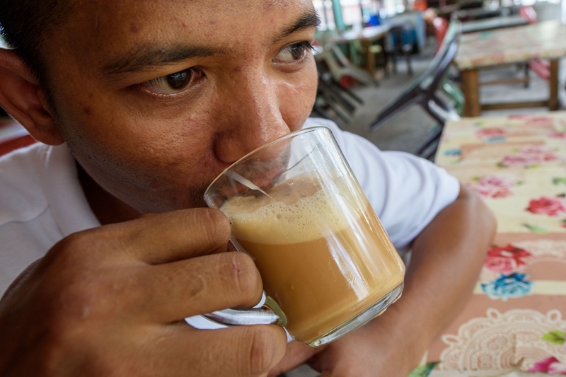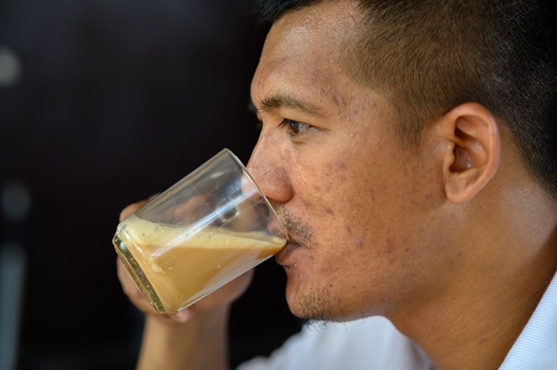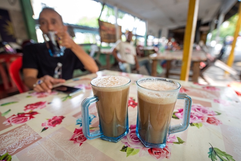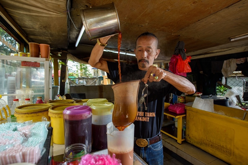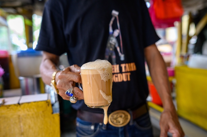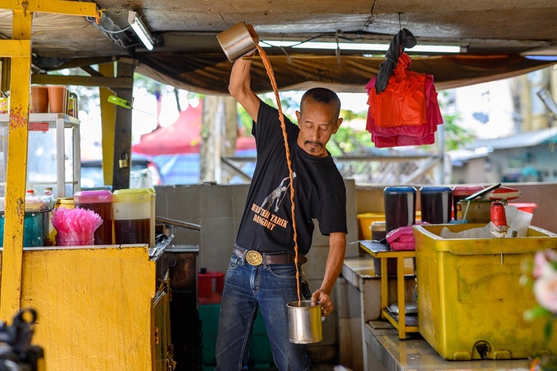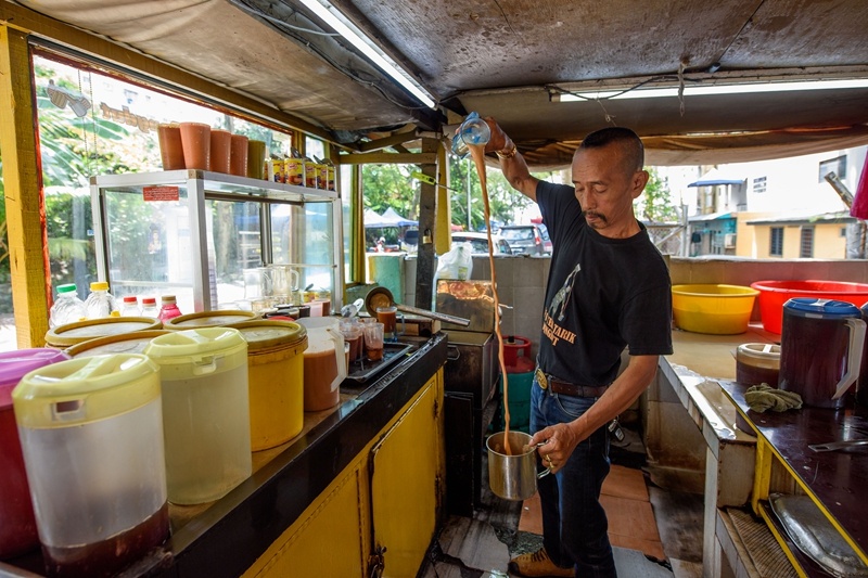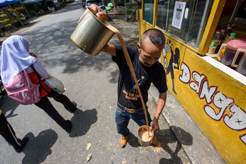 ↑5月18日,一名男子在馬來西亞雪蘭莪州的必打靈查亞飲用拉茶。