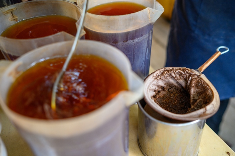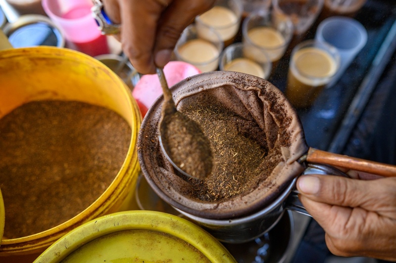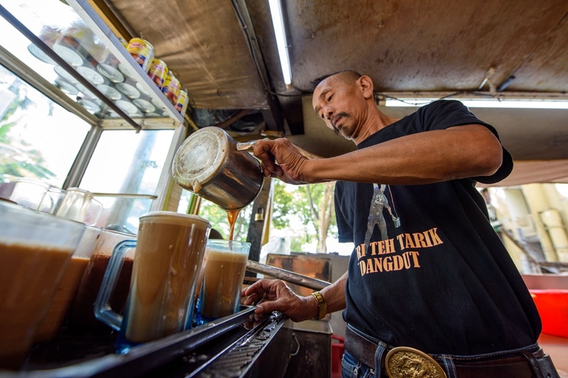 拉茶是馬來西亞最普遍和最受歡迎的國民飲料之一。拉茶的主要成分是茶葉和煉乳,其制作過程是使用兩個(gè)大茶缸,把沖泡好的茶水與煉乳混合后來回多次從高處往下倒,動(dòng)作猶如將茶湯在兩個(gè)茶缸間來回拉,這樣可以使茶水和煉乳混合更為充分。拉得越長,起泡越多,茶香與奶香越能獲得充分發(fā)揮,口感也會(huì)更加順滑。