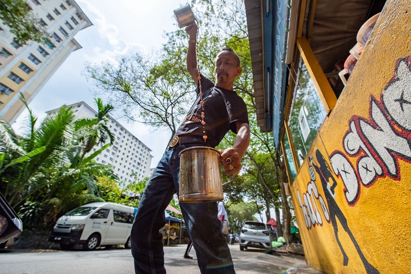 ↑5月18日,在馬來西亞雪蘭莪州的必打靈查亞,穆赫德·扎布里在制作拉茶。穆赫德·扎布里在必打靈查亞經(jīng)營拉茶店已超過20年,他制作的拉茶深受當(dāng)?shù)鼐用裣矏邸?/p>