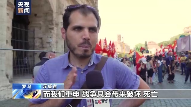 在羅馬,數(shù)百名示威者從共和國廣場出發(fā),一路行進(jìn)到古羅馬斗獸場。很多人手舉標(biāo)語,高喊口號(hào),抗議意大利政府向?yàn)蹩颂m提供軍事支持的決定。
