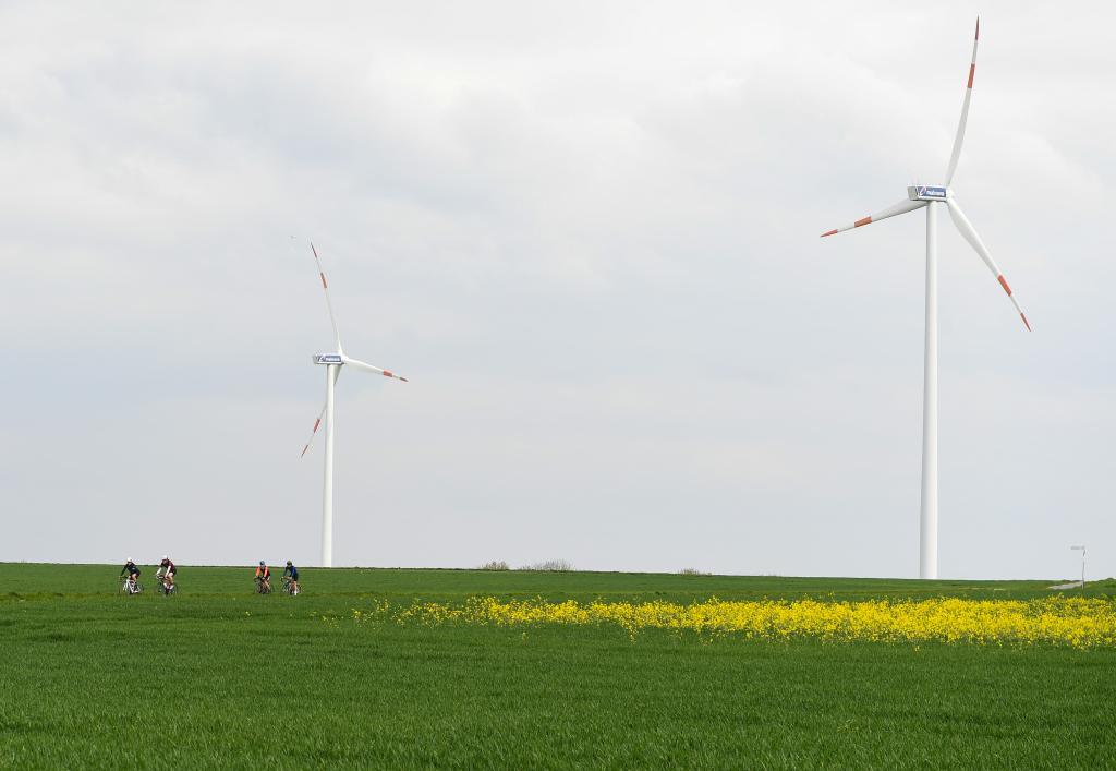 人們騎自行車從德國法蘭克福郊外的一處風(fēng)電機組前經(jīng)過。新華社記者 逯陽 攝