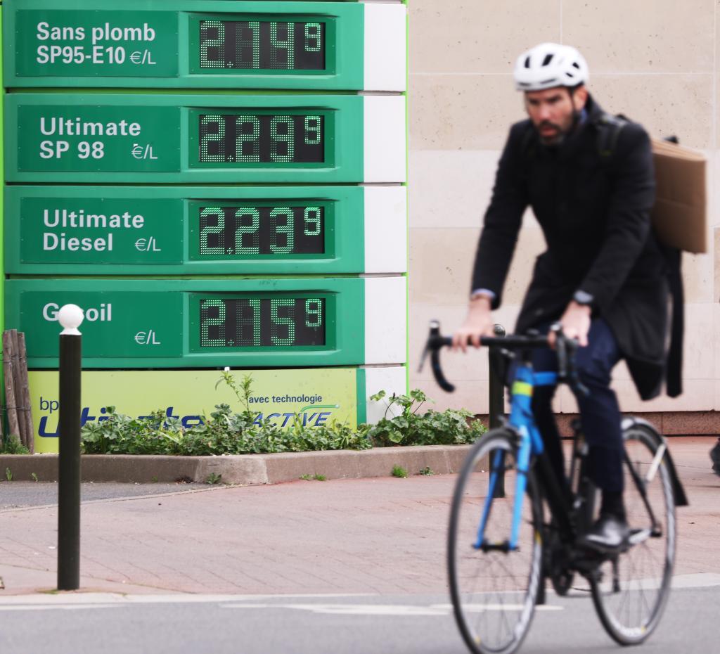 一名男子騎車經(jīng)過法國巴黎一處加油站。新華社記者高靜攝