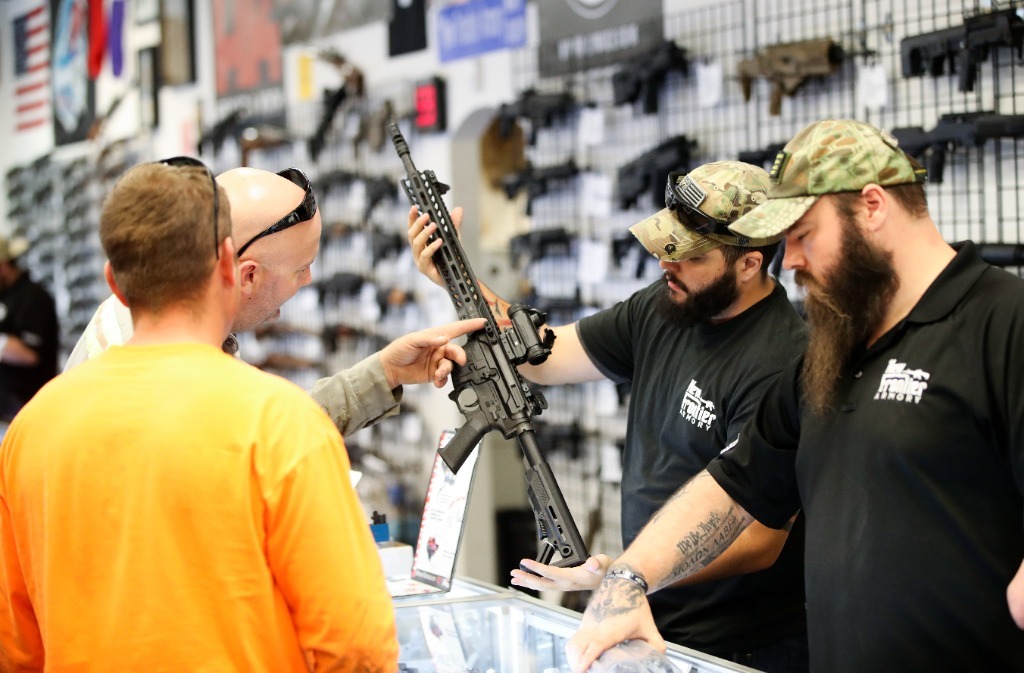 2017年10月4日,在美國拉斯維加斯的“新前線”槍械商店,店員為顧客展示槍支。新華社記者 王迎 攝