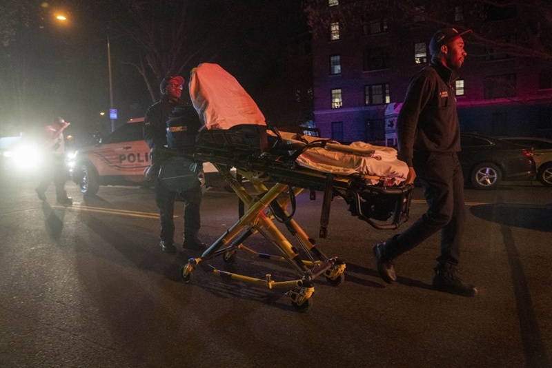 ↑4月22日,在美國首都華盛頓,救護人員在槍擊事件現(xiàn)場工作。新華社記者 劉杰 攝