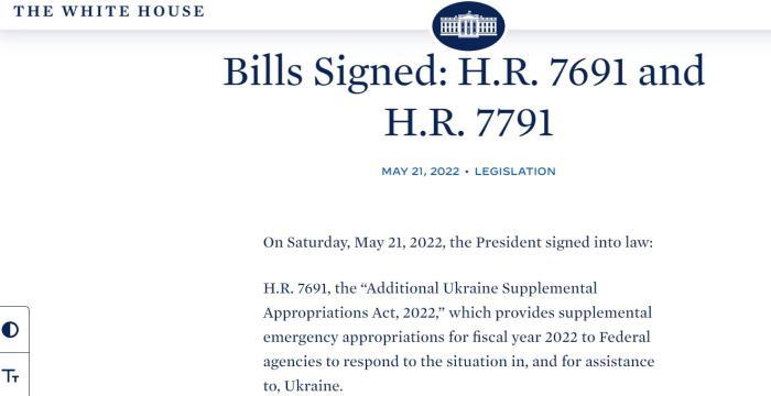 美國白宮網(wǎng)站顯示,5月21日,總統(tǒng)拜登簽署對烏克蘭額外援助法案。圖片來源:白宮網(wǎng)站
