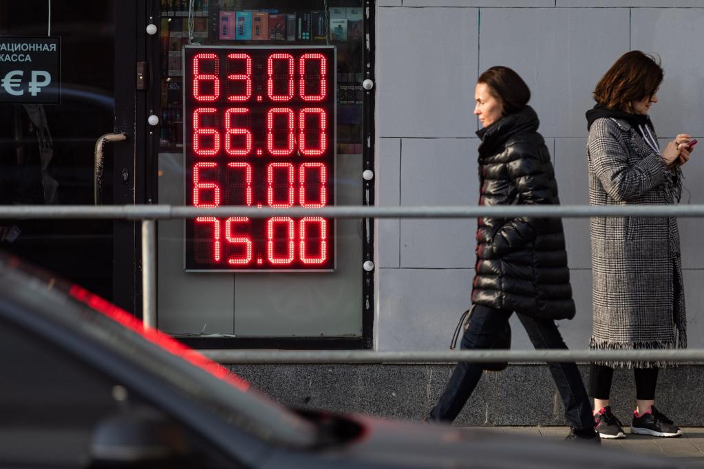 2022年5月24日,在俄羅斯首都莫斯科,行人經(jīng)過一家外匯兌換點(diǎn)。新華社記者白雪騏攝