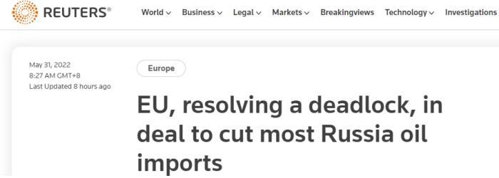 路透社稱(chēng),歐盟解決了僵局,達(dá)成一致禁止俄大部分石油進(jìn)口。圖片來(lái)源:路透社報(bào)道截圖。