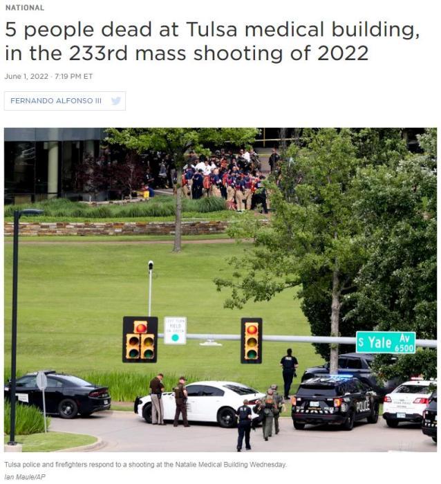 當(dāng)?shù)貢r(shí)間6月1日,美國(guó)俄克拉何馬州塔爾薩市發(fā)生槍擊案。圖片來(lái)源:美國(guó)國(guó)家公共廣播電臺(tái)(NPR)報(bào)道截圖