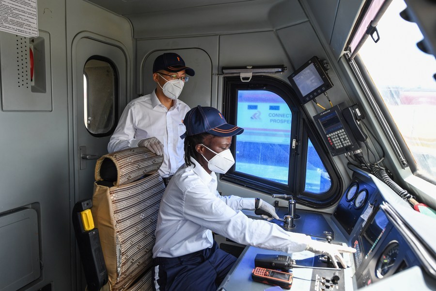 2021年3月22日,在肯尼亞首都內(nèi)羅畢,蒙內(nèi)鐵路指導(dǎo)司機(jī)楊明和他的肯尼亞女徒弟康西莉亞在機(jī)車(chē)內(nèi)進(jìn)行發(fā)車(chē)前的檢查工作。(新華社記者李琰攝)