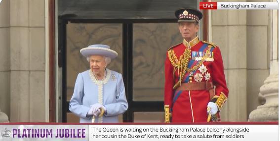 當(dāng)?shù)貢r(shí)間6月2日,英國(guó)女王白金禧年慶典在倫敦開(kāi)幕,英女王當(dāng)天身穿淺藍(lán)色套裝現(xiàn)身白金漢宮的陽(yáng)臺(tái),望向前來(lái)慶賀的人群。圖片來(lái)源:英國(guó)天空電視臺(tái)直播視頻截圖。