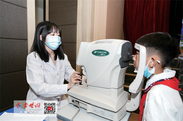 活動現(xiàn)場,國藥東風(fēng)總醫(yī)院眼科中心為學(xué)生檢查視力