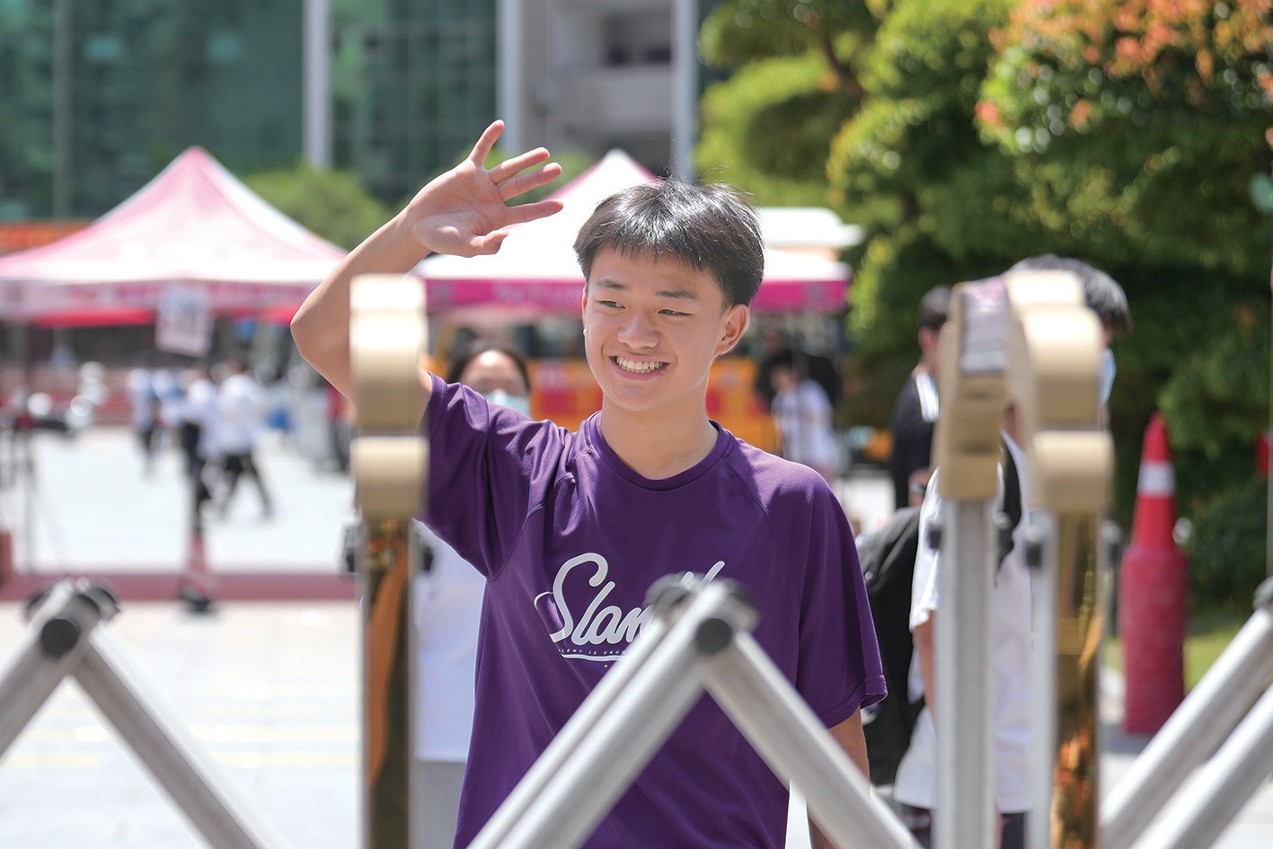 考點里,學生們有序排隊、測溫、驗證,依次進入考場;考點外,一條警戒線將老師、家長們隔離在外。盡管天氣炎熱,老師和家長們還是守在校門口,滿懷希望的目光始終跟隨著孩子。