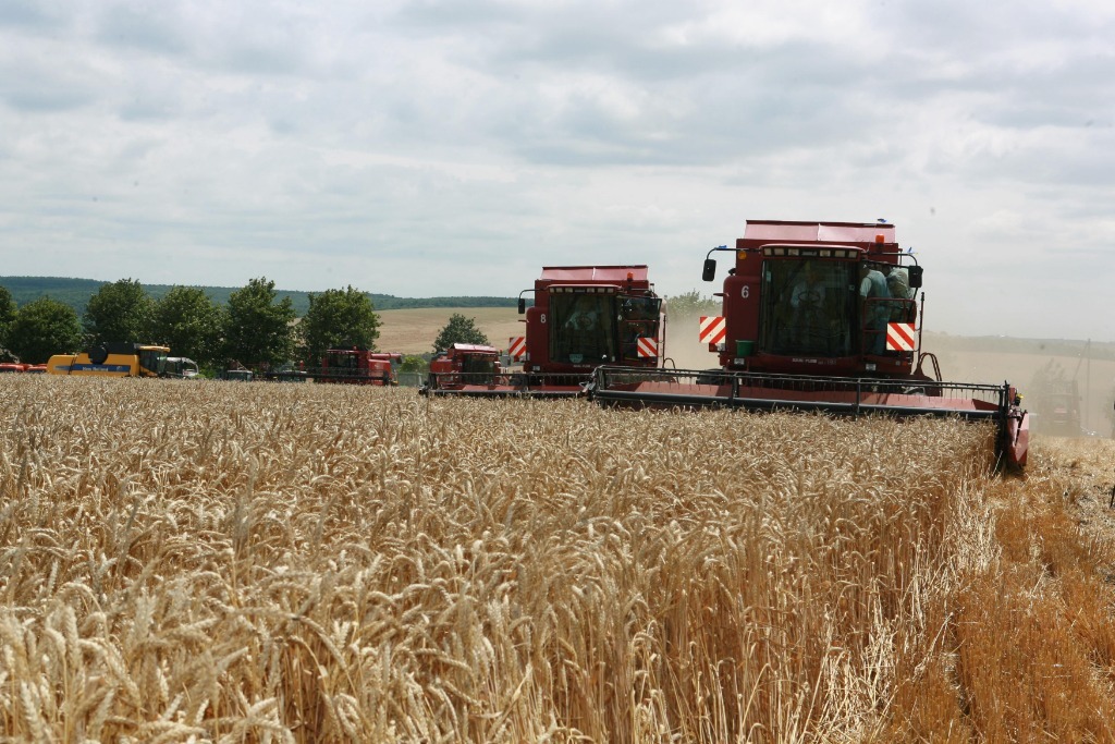 2008年7月17日,在烏克蘭西南部的文尼察州,大型聯(lián)合收割機(jī)在收割小麥。新華社記者宋宗利攝